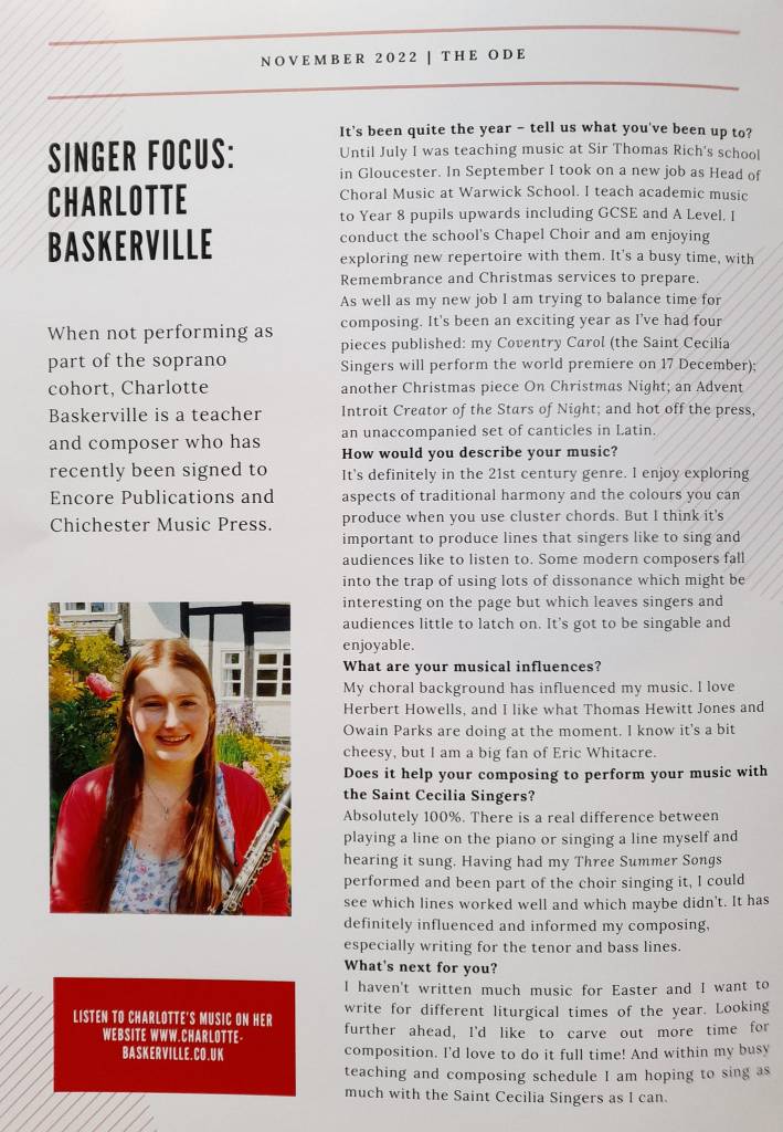 Charlotte’s compositions are published by Encore Publications, Chichester Music Press and Banks Music Publications (Kassian Choral Series) and recorded on the Resonus Classics label by St. Martin’s Voices. Her works have been performed across the UK by numerous leading ensembles including: Winchester Cathedral Choir, Salisbury Cathedral Choir, Chichester Cathedral Choir, Bristol Phoenix Choir, York Minster Choir, Ely Cathedral Choir, Tewkesbury Abbey Choir, The Choir of Christ’s College Cambridge, The Choir of Peterhouse College Cambridge, The Guild Chapel Choir (Stratford-Upon-Avon), Bristol Cathedral Consort, St. Bartholomew The Great, St. Cecilia Singers (Gloucester Cathedral), Bath Abbey Choir, and Musica Deo Sacra (Tewkesbury Abbey).